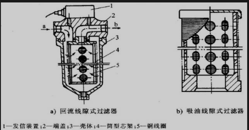 線隙式過(guò)濾器的濾芯,是一種用銅線或者鋁線緊密纏繞在筒形骨架上的濾芯,油液經(jīng)過(guò)金屬線之間的孔隙,進(jìn)入內(nèi)部,再?gòu)纳戏降目椎懒鞒觯@種過(guò)濾器結(jié)構(gòu)簡(jiǎn)單,通量大,特別適合于要求不間斷地精細(xì)過(guò)濾油品的場(chǎng)合,多用于回油過(guò)濾。但過(guò)濾器的結(jié)構(gòu)較為復(fù)雜、制造精度要求較高,且濾芯材料強(qiáng)度低,不易清洗。