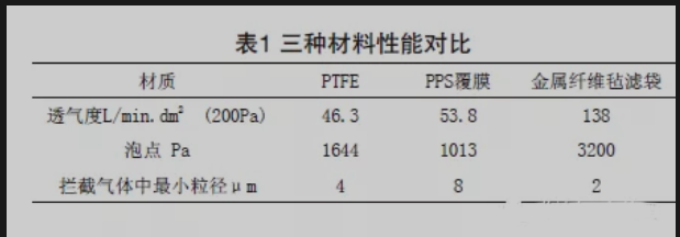 袋式除塵器在高溫下工作時,由于熱膨脹效應,布袋的孔徑會增大,而金屬材料在允許溫度范圍內性狀穩定。目前排放能達標的布袋應用較多的是PPS覆膜濾料 及PTFE濾料。經檢測的濾料都是廠家稱可攔截1μm粉塵 的濾料。表1是幾種材料的對比。在有壓力的情況下,柔性布袋的泡點較金屬纖維氈低,說明氣泡較容易從布袋孔中冒出。所以在實際使用中,布袋孔徑受到溫度和壓力的雙重作用,孔徑會增大,過濾精度會受到影響。而金屬纖維氈濾料不會出現這種問題。