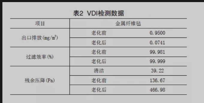 VDI檢測是國際上通用的袋式除塵器濾料檢測標準 儀如圖2)。根 據袋式除塵器技術要求(GB/ T 6719 – 2009):首先進行30次定壓(1000Pa)噴吹過程,測試和 計算濾料的初始除塵效率、出口粉塵濃度及殘余壓降;接著進行1萬次老化 噴吹過程;然后再進行10次定壓噴吹恢復 過程;后進行30次 定壓噴吹過程,得出老化后濾料的各項數據,結果見表2。由表2中可以看出,金屬纖維氈的排放濃度可接近“零排放”。調節排放濃度可以通過調整結構來實現。