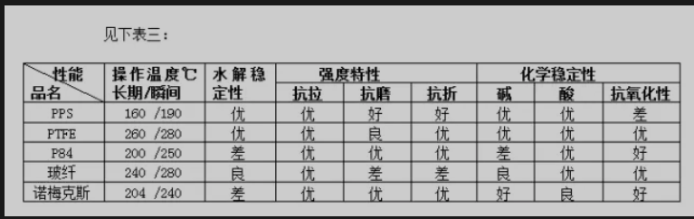 根據表三,就應對化學腐蝕影響,電廠常用的相關濾料材質,PTFE 優于PPS和P84。
