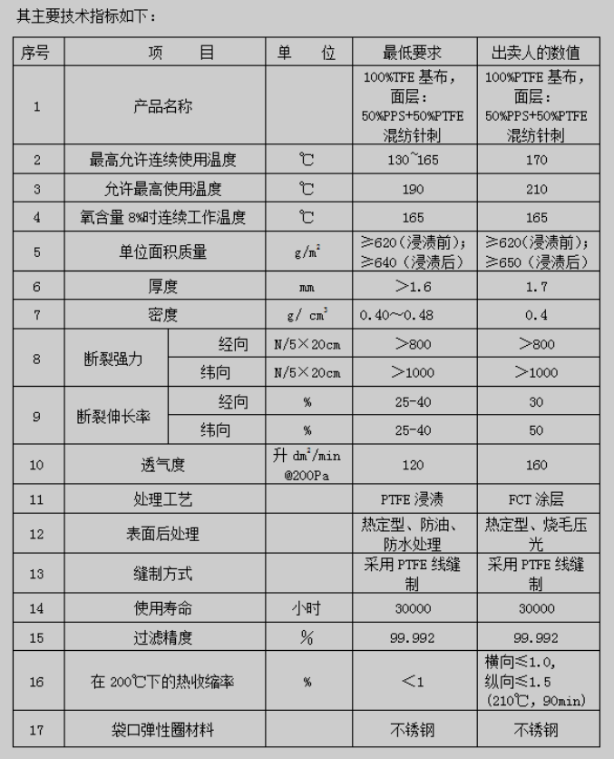 鑒于對濾袋的檢測結果,濾袋需盡快進行更換。根據檢測情況看原設計材質為PTFE基布,迎塵面和背塵面為100%聚苯硫醚纖維(進口),已不在適用該廠運行工況,需對濾袋材質進行改型。