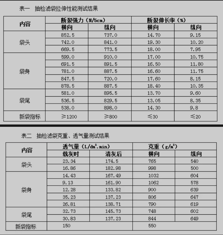 表一、表二為抽檢濾袋的常規性能測試結果。抽檢濾袋橫向強力明顯下降,尤其袋尾段;清灰后,局部透氣氣量偏大,歸因于濾袋局部纖維層被磨損裸露基布;克重偏大,歸因于濾料表面仍粘結粉塵。